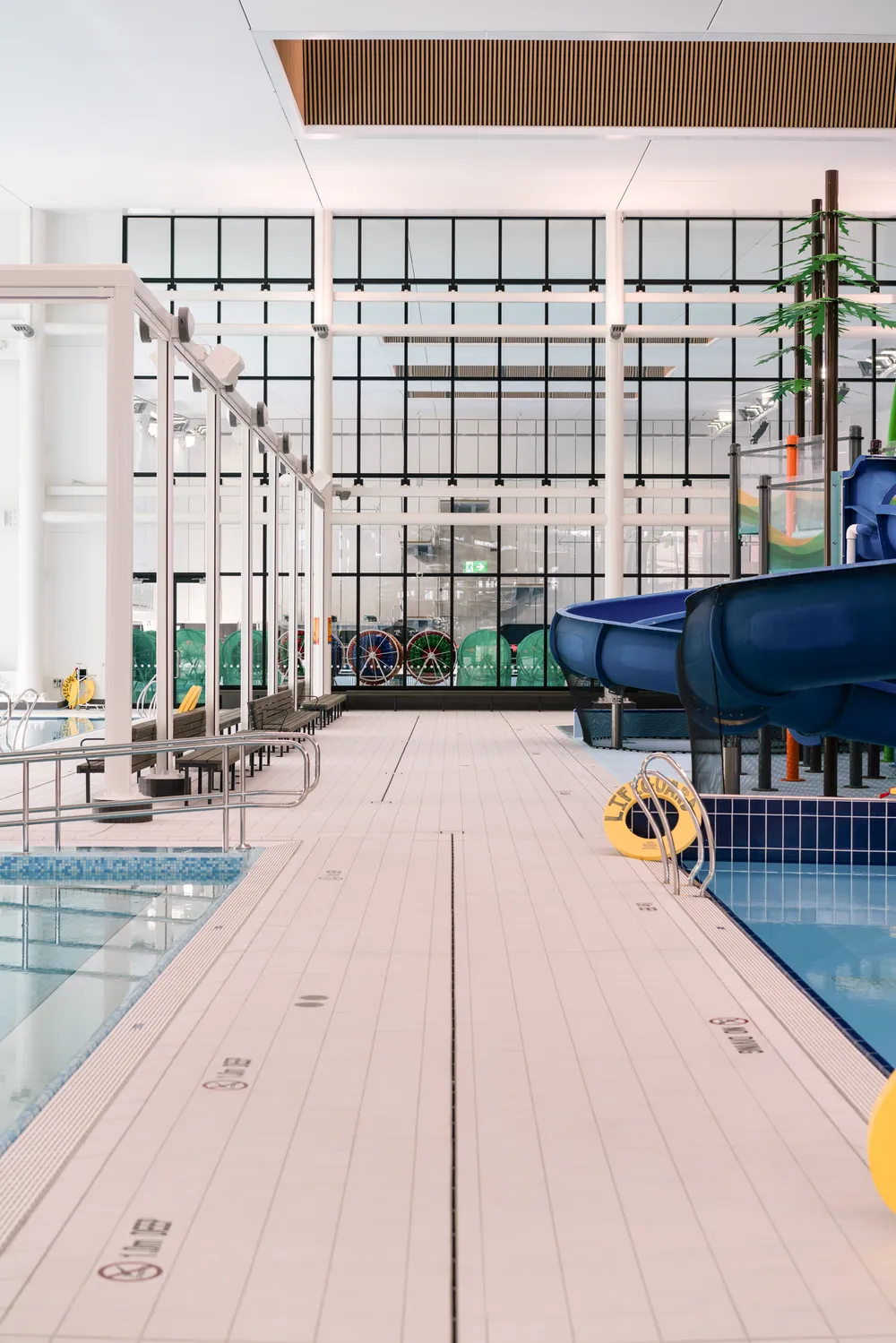 Warren and Mahoney worked closely with our design and construction partners to ensure this kaupapa was embedded in the build, integrating Ngāi Tahu cosmology and the ethic of kaitiakitanga. Divided into two primary zones of wet and dry, Parakiore’s form is linked by a central spine, with each element aligned to Tangaroa (water), Papa-tū-ā-nuku (earth), and Rangi-nui (sky). Other cultural references include hydroslides emulating silver-bellied eels, exterior panels featuring Pātiki (flounder) motifs, and central hub floor tiling reflecting Rangi-nui and the movement of forest pathways.