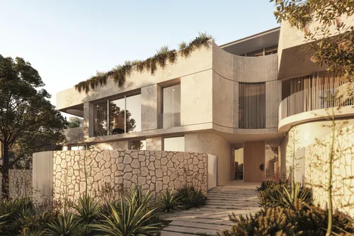 The building facade and entry, inspired by the movement of waves and coastal wind, blend seamlessly into the surroundings. The textural palette and soft hues evoke the sand and sea, creating a serene living environment.