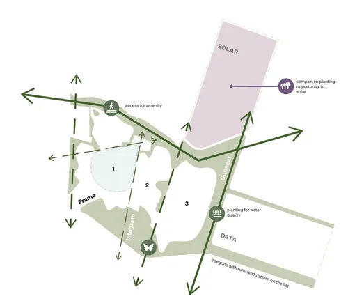 The creation of a powerful sense of place begins with grounding experience in the landscape itself. Our landscape design re-establishes a strong vegetated framework across the site, structured along stream corridors and reflecting the surrounding rural land pattern. This framework enables the seamless integration of the lagoon and associated development into the broader landscape, forming a cohesive backdrop within which diverse activities and experiences can be thoughtfully developed and curated across the wider Surf Park Community Masterplan.