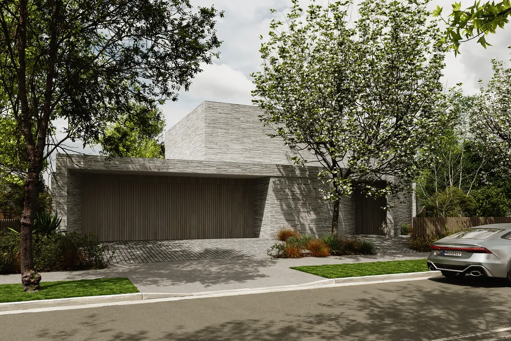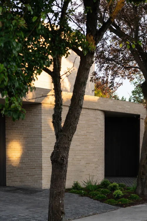 The arrival experience is carefully choreographed, defined by basalt stone cobbles that extend seamlessly into the adjacent landscape. The monolithic all-brick façade presents a robust and restrained public face, punctured only by a dark-stained cedar entry door and blind-cut garage door, subtly expressing points of public movement while maintaining privacy and solidity to the street.
