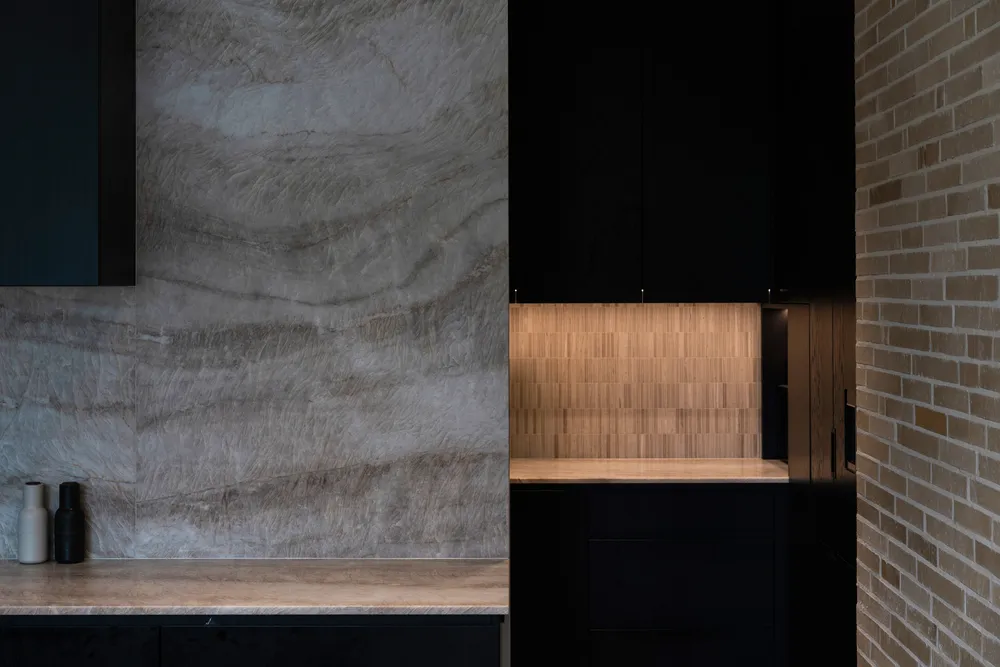 Internally, the threshold between outside and in is deliberately blurred. A dark-toned entry foyer inherits the external material palette, creating a sense of compression and enclosure upon arrival.