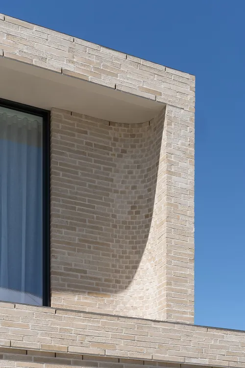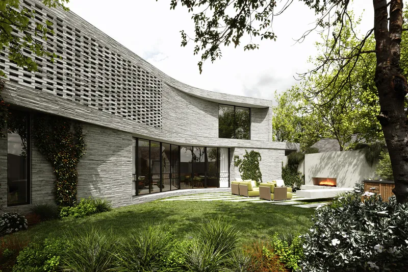 Formally, the two-storey brick volume is subtly curved to soften hard edges, while intentional offsets between upper and lower forms break down the overall mass and introduce a horizontal rhythm that resonates with neighbouring dwellings. By pulling the building toward the south and east boundaries, the design departs from suburban convention, freeing up a generous north-west facing outdoor space. A 40-degree crank in the floor plan responds directly to the site geometry, orientating the house toward sun and reinforcing the project’s dialogue between form, context, and family life.
