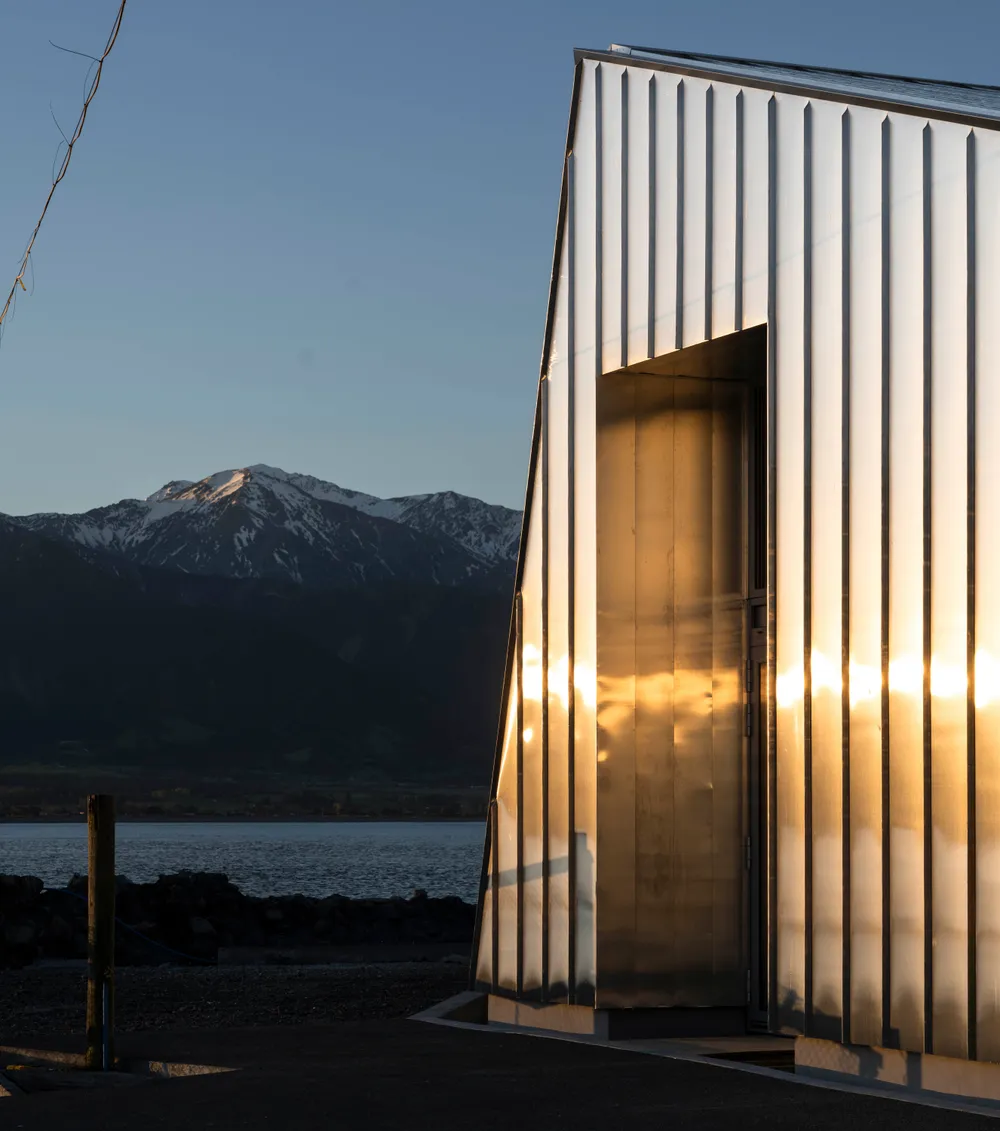 Durability is a defining principle. Marine-grade aluminium cladding and zipped panel systems provide long-term resilience in the harsh coastal environment and will weather gracefully over time. Façade engineering and structural detailing ensure robust performance under extreme wind and marine conditions. A complementary lighting strategy has been devised to support the scheme that recognises the dark skies cloaking Kaikōura. The value is two-fold for the local community and its ecology, while also providing activation opportunities for the wharf space into the evening. The design intent is to keep light spill low and reduce any adverse effects on the dark skies and the surrounding residential area.